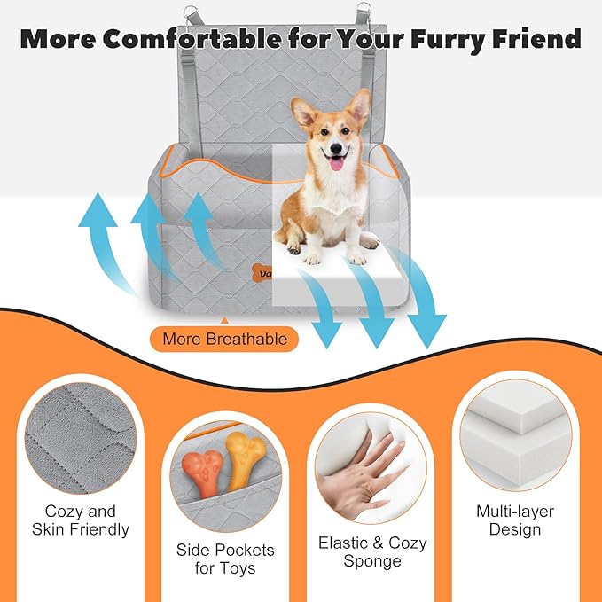 - Security & Comfort: The travel seat for dogs is made of hard-wearing polyester fiber that is strong and long-lasting. High quality sponge padding provides stable support to the bottom and sides of the dog booster seat, creating a cosy and comfortable space for your beloved pet. 4-inch thick sponge cushion raises the dog seat, allowing most dogs to enjoy the view out the window and relieve travel anxiety.