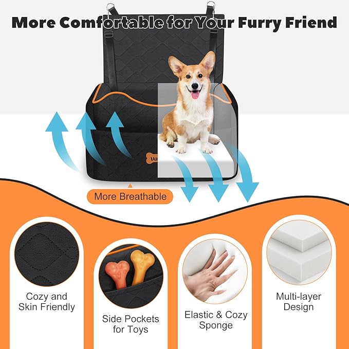 - Security & Comfort: The travel seat for dogs is made of hard-wearing polyester fiber that is strong and long-lasting. High quality sponge padding provides stable support to the bottom and sides of the dog booster seat, creating a cosy and comfortable space for your beloved pet. 4-inch thick sponge cushion raises the dog seat, allowing most dogs to enjoy the view out the window and relieve travel anxiety.