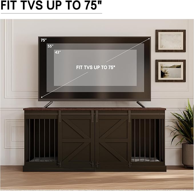 Dog Crate Furniture - Indoor Wooden Dog Kennel Furniture with Room Divider and Double Sliding Barn Doors - 71”x23.6”x31.5”H, Black