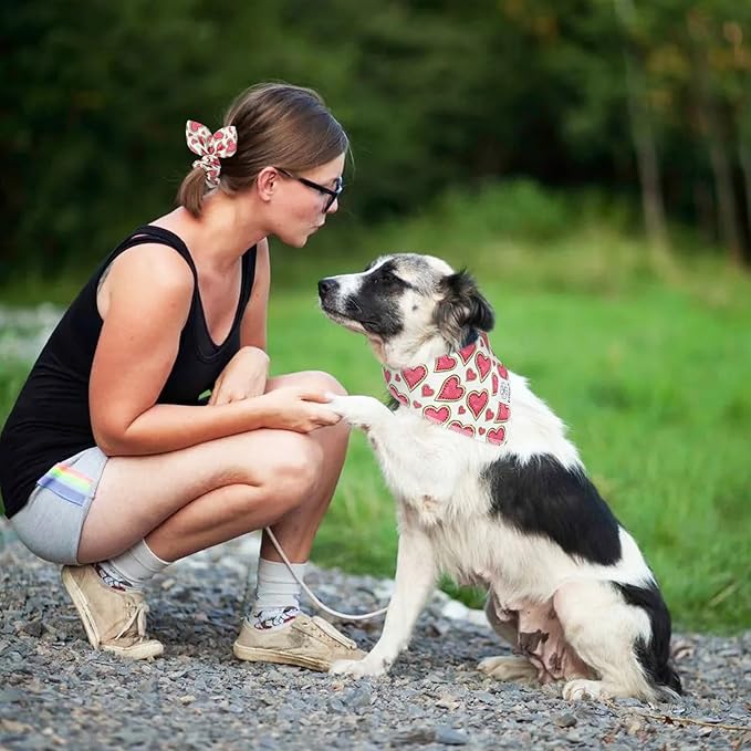 - Dog Bandanas Girl Size: 26x16.5x16.5inchs (66cm *42cm *42cm).The adjustable cute dog bandanas fit pet neck size up to 18.9inchs (48cm).You can roll the dog bibs a couple of times to fit your dog if it’s too large. Please measure your dog’s neck before buying.Pink heart scrunchies is one size fits all.