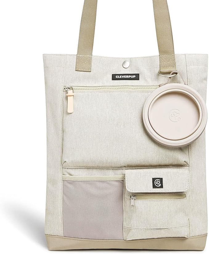 - EASY TO CLEAN – The tote is made from woven polyester with stylish vegan leather details, and features a wipe-clean coated base, making for easy cleaning. The travel bowl is dishwasher-safe!