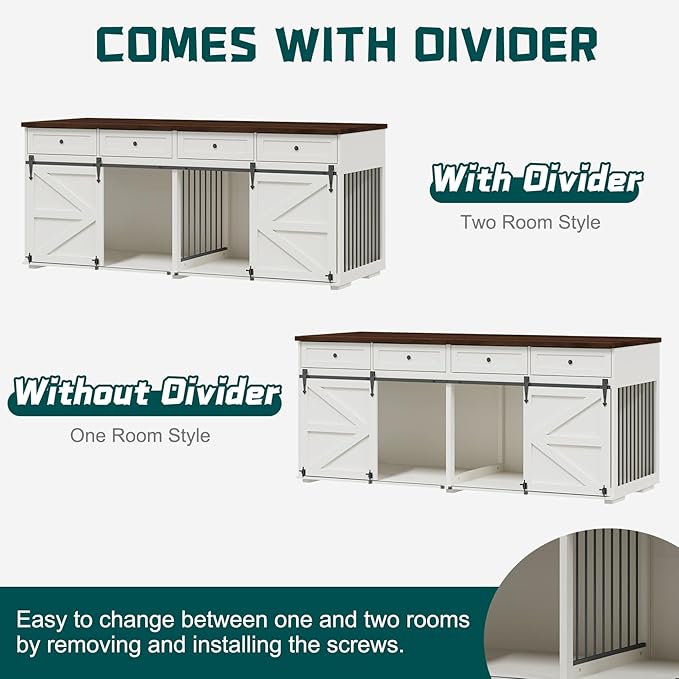 - COMES WITH REMOVABLE DIVIDER - Our dog crate furniture features a smartly designed detachable center panel that effortlessly converts the space from one large compartment to two separate sections. The included extra divider gives you versatile setup choices to perfectly adapt to your pet's growing needs and your home's layout preferences.