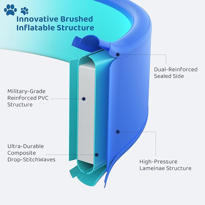 - Innovative Brushed Inflatable Design: This dog pool is made of ultra-durable thickened PVC material and double-wrap craftsmanship, while using innovative brushed inflatable design to keep its shape in place no matter how intense the play. Eliminates water leakage caused by collapse and deformation. Let you and your pet or child enjoy a carefree summer day!