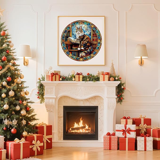 Wooden Puzzles for Adults - Maine Cat Library Wooden Jigsaw Puzzle, Unique Animal Shaped Wood Puzzles Adult, Christmas Birthday Gifts for Friends/Family, Home Decor 8.5 * 8.5in 100pcs