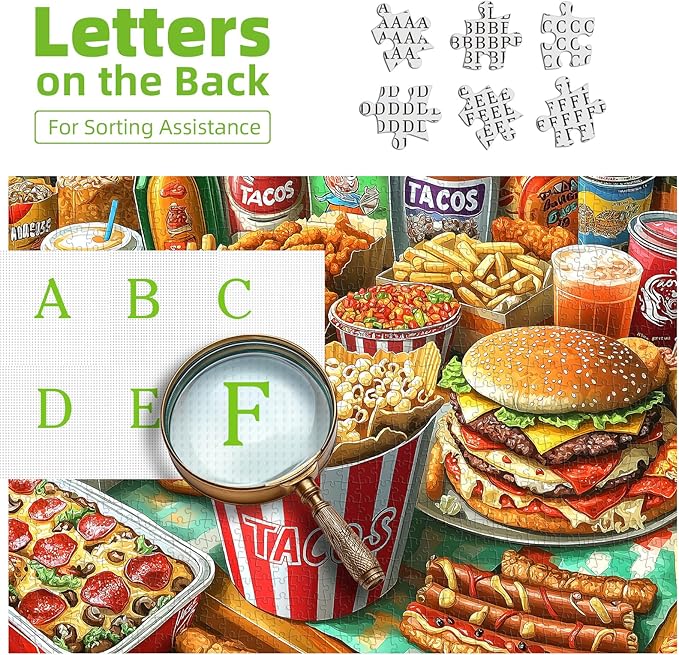 - đ§©Delicious Food Theme with High-Quality Design: Experience the mouth-watering appeal of a juicy burger and crispy fries with this 1000-piece puzzle.Perfect for adults, this jigsaw puzzle combines stunning images and high-definition printing to create a realistic food scene that youâll love piecing together. Whether you're an experienced puzzler or a beginner, this puzzle will provide hours of relaxation and entertainment for individuals and groups alike. Its precise, high-quality cuts make each connection secure and satisfying