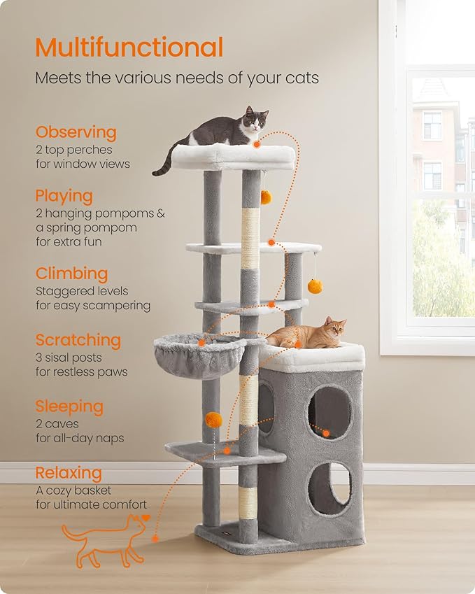 Feandrea Tall Cat Tree Tower, Multiple-Level Cat Condo with 2 Caves, 3 Scratching Posts, 3 Perches, Dove Gray UPCT007G01