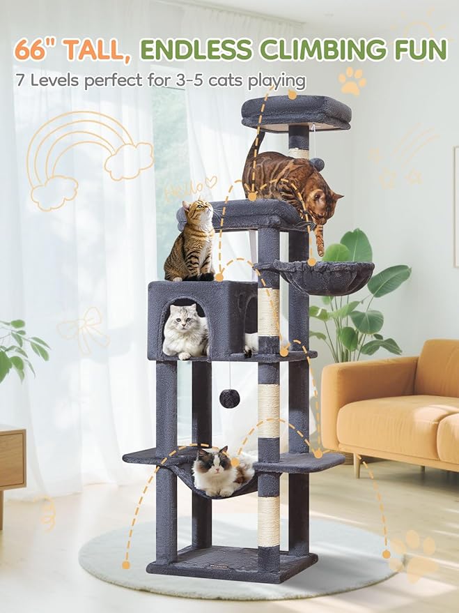 Taoqimiao MS042G Cat Tree,66-inch Large Cat Tower with Scratching Posts, Luxurious Large Platform for Big Cats with Soft Hammock, Adjustable Basket, Deluxe Cat Cando, Top Perch Smoke Gray