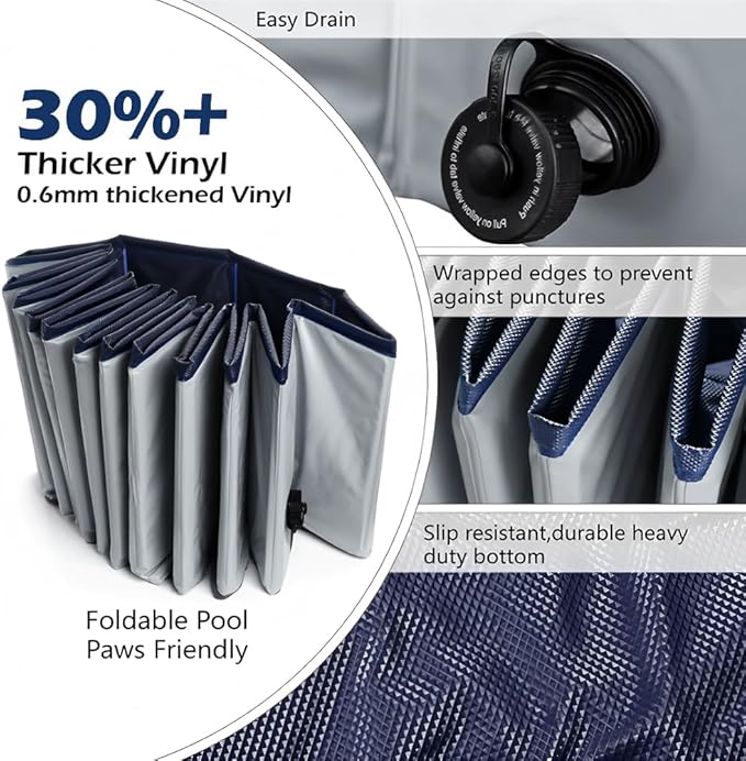 - DURABLE PVC MATERIAL:The dog pool is made of high quality PVC with built-in thick MDF, which can stably support the whole pool when unfolded and not easy to collapse. The non-slip bottom prevents your pet from slipping when jumping in the tub. (Choose a flat ground with no sharp objects to place the pool on.)