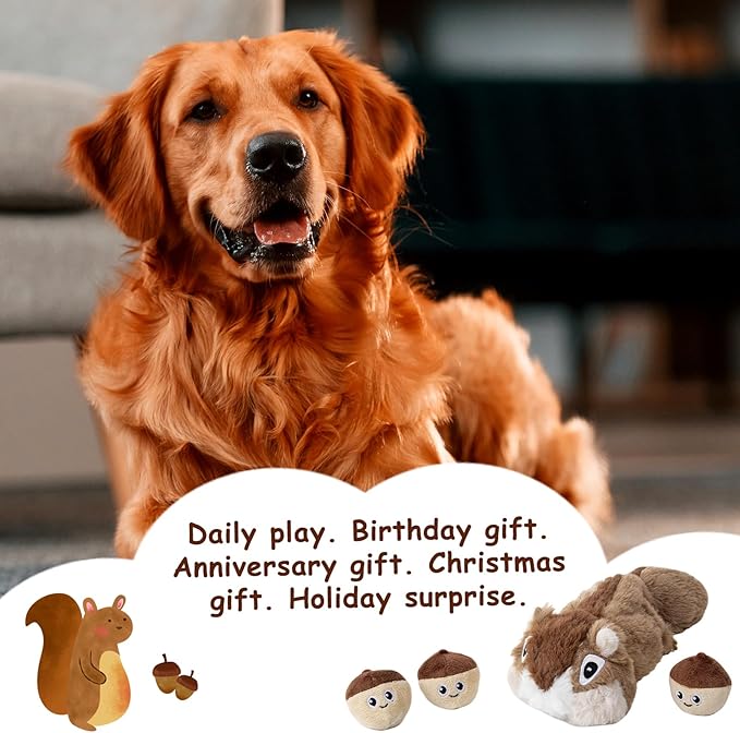 - Funny Dog Toys Great for Multiple Dogs - Squirrel size: 12 x 4.5 x 3.5 inches, Pine Cones size: 2 inches. 3 toys included, each puppy chew toy has one round squeaker. Prefect dog toys for large dogs and good traing toy for puppies small, medium and large dogs