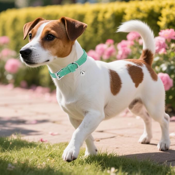 PUPTECK 2 PCS Soft Genuine Leather Cat Kitten Collar with Bells Adjustable for Girl Boy Cats Puppy - Blue Green, Bubble Green