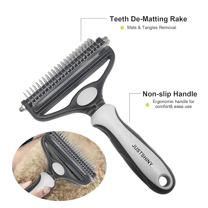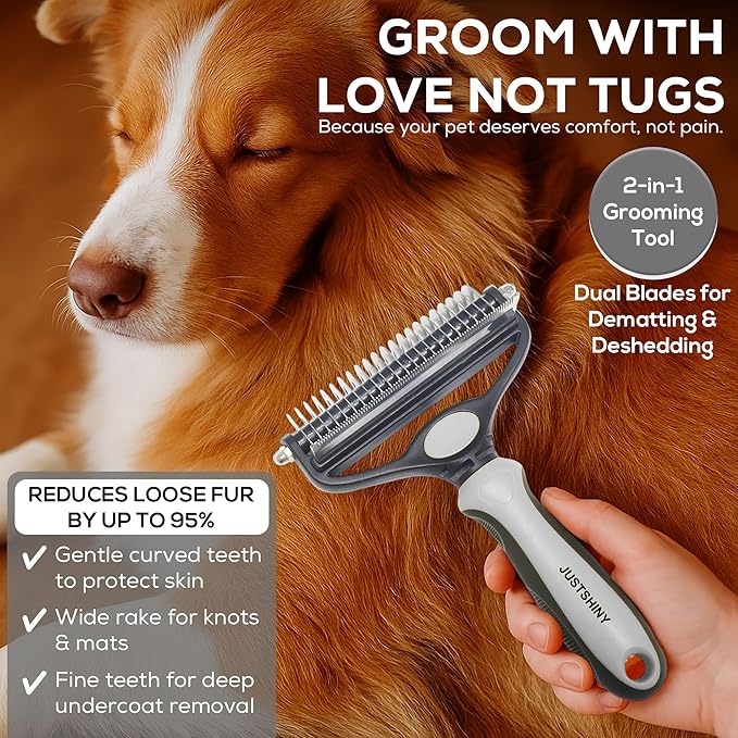 - JUSTSHINY ALL-IN-ONE GROOMING KIT – Thoughtfully designed for your pet’s well-being, this kit includes a deshedding brush and two silicone toothbrushes (standard and finger style) to keep your furry friend clean, healthy, and happy—every day