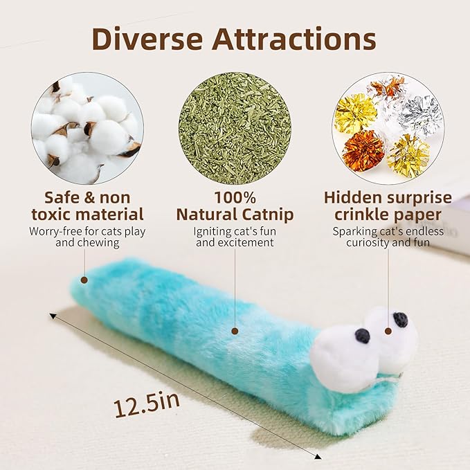 - Cute caterpillar-shaped:This cat toy designed with big, expressive eyes and soft, fluffy fur, providing a playful experience for your cat. It’s like they’re frolicking in the grass, pouncing on a caterpillar, sparking endless fun.