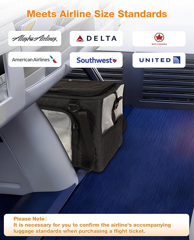 - TSA APPROVED PET CARRIER IN CABIN: Fly worry-free knowing the PETUX airline approved pet carrier meets cabin size standards for Alaska (17" × 11" × 9.5"), Southwest, Delta, United, American, and Air Canada airlines. Measuring 16" × 10" × 9.5", it easily slides under airplane seats so your cat can stay close and comfortable throughout the journey. Perfect for small cats up to 10 lbs