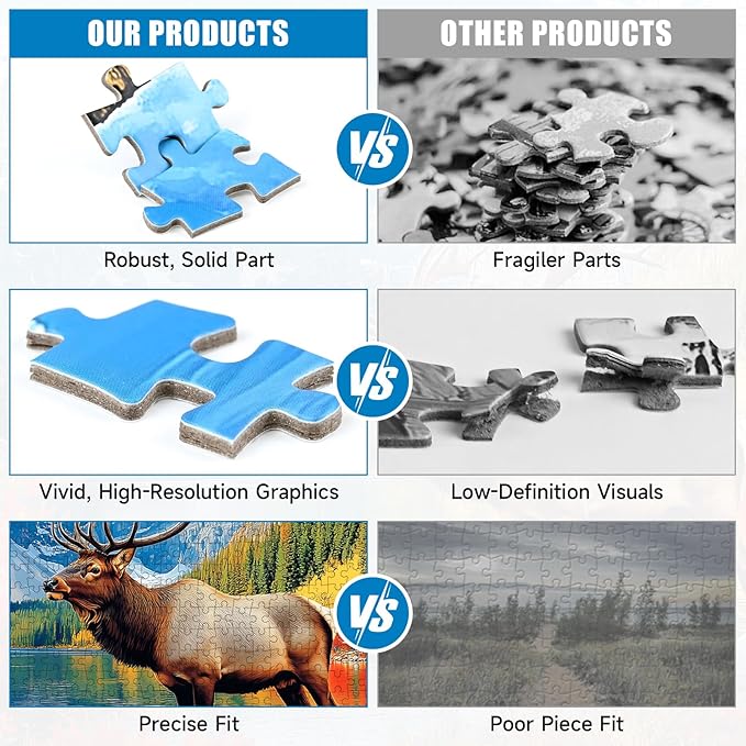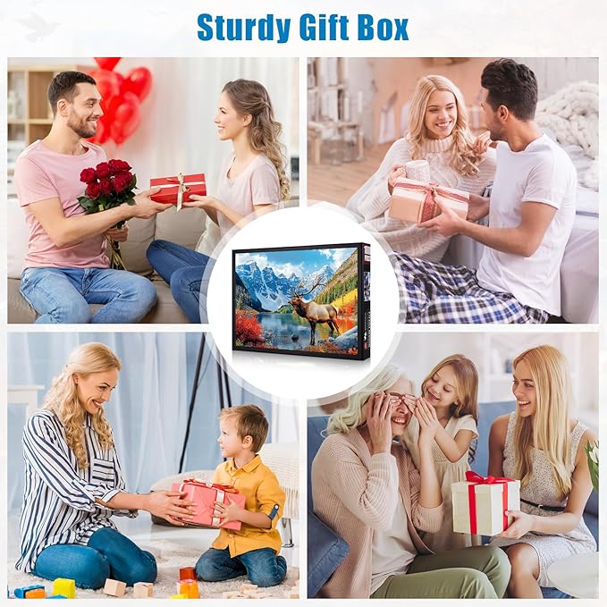 - Breathtaking Fall Mountain Landscape: Immerse yourself in the serene beauty of nature with this 1000-piece puzzle for adults. The stunning scene features a majestic elk with impressive antlers standing by a tranquil mountain lake, surrounded by vibrant fall foliage and snow-capped peaks, offering a challenging and rewarding escape