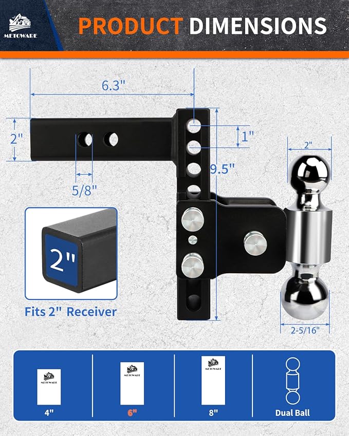 METOWARE Adjustable Trailer Hitches Fits 2-Inch Receiver - Adjustable Ball Mount with 6-Inch Drop/Rise (12,500 LBS GTW) - Dual Ball (2'' x 2-5/16'') and Anti-Theft Stainless Steel Trailer Lock