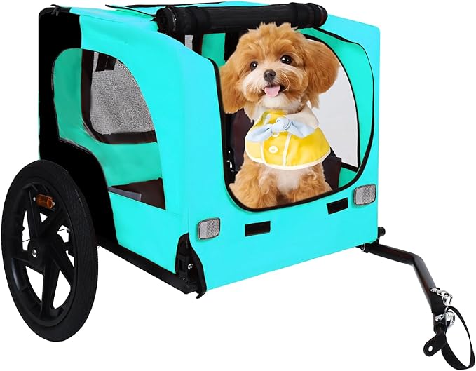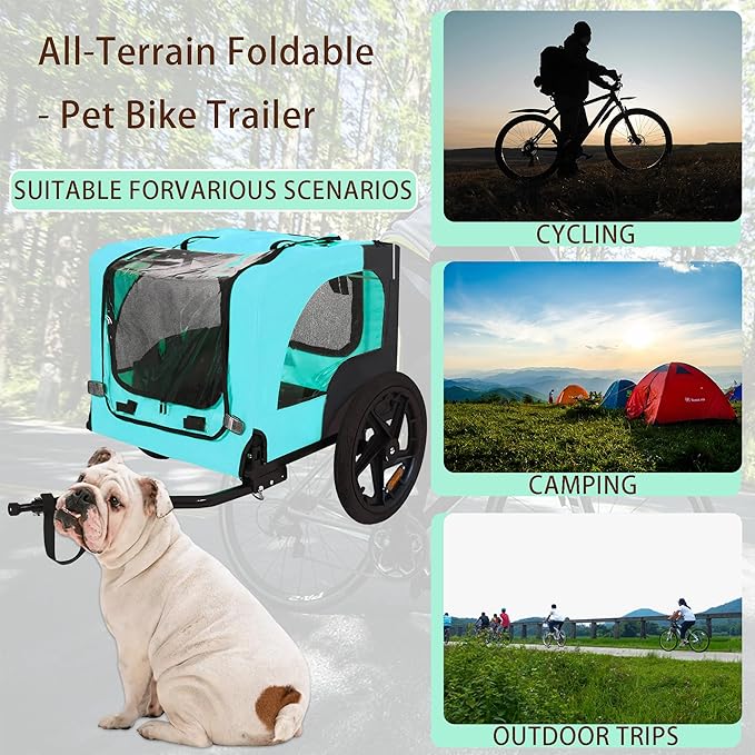 - Convenient Access & Portability: The rear doggy door offers hassle-free loading, and the lightweight foldable frame fits effortlessly into car trunks. Built for adventure, this trailer combines comfort, safety, and practicality for pets and owners alike