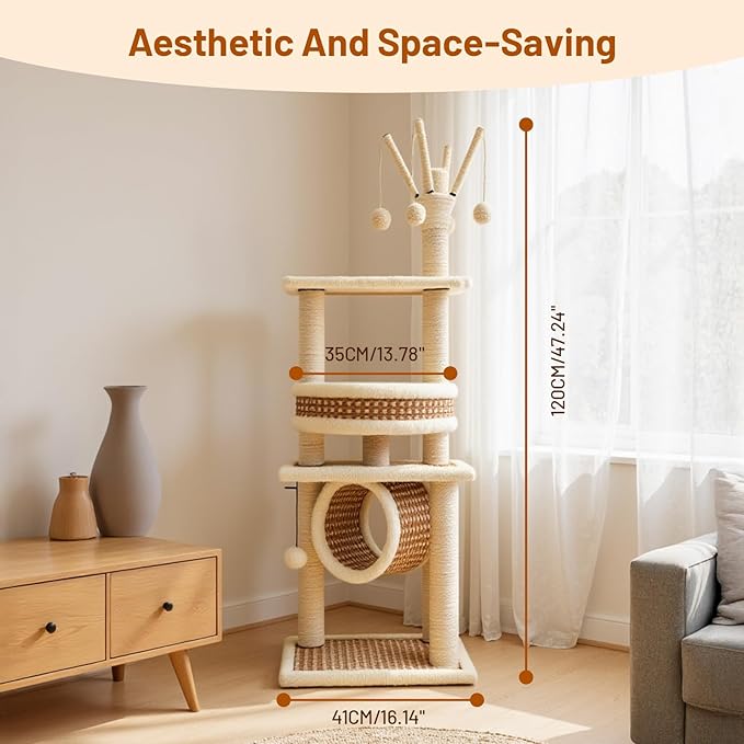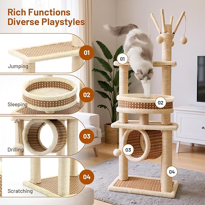 - Multi-Level Fun & Exercise:At 57.87”tall, this cat tower with scratching post offers 6 platforms for climbing, jumping, and observing. Features include a sisal scratching post, a woven lookout perch, a hanging bed, and a plush toy ball—keeping your cat entertained and furniture safe.