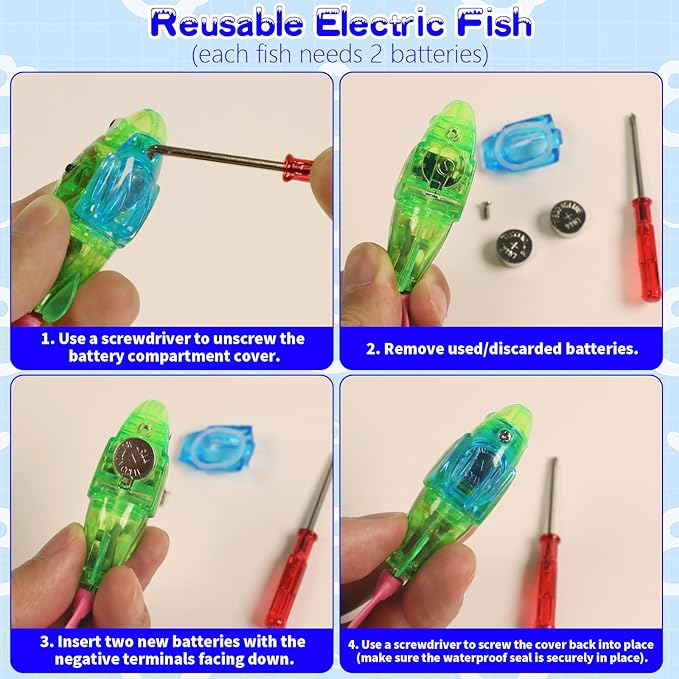 - Sensor activation, no remote control required: No remote control needed! Simply touch the fish sensor and place it in the water to immediately activate swimming mode. It will automatically turn off when removed from the leak-proof cat pool (12 inches in diameter). Comes with 6 spare batteries and a screwdriver — ready for endless fun!