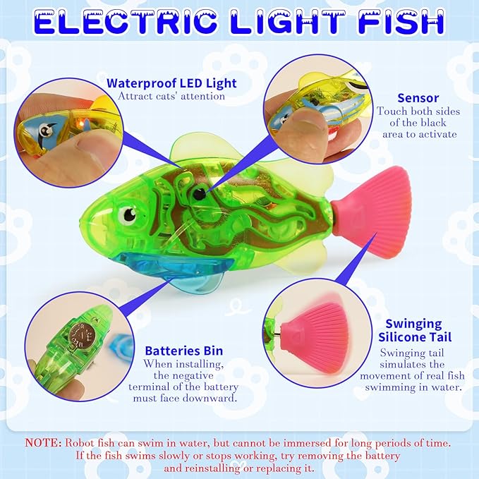 - Robo Fish:Simply place our robotic fish into a cat pool filled with water, and it will automatically activate, swimming realistically and accompanied by LED lights. This will stimulate your cat's hunting instincts, allowing them to engage in a thrilling simulated hunting experience.(Note: There is no battery installed in the fish body, need to install the battery to use!!!)