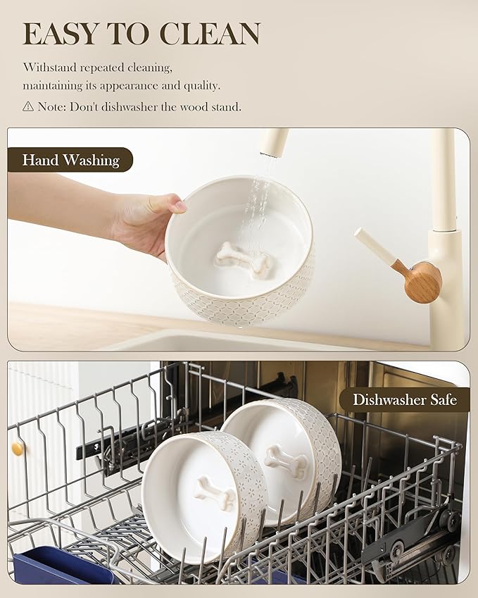 - š¦“ćEASY MAINTENANCEćThe ceramic bowls can be easily removed from the wooden stand for quick cleaning and convenient refilling. Featuring an active glaze finish, they are dishwasher safe and easy to clean by hand. Microwave safe as well, these bowls allow you to warm up your pet's food whenever needed.