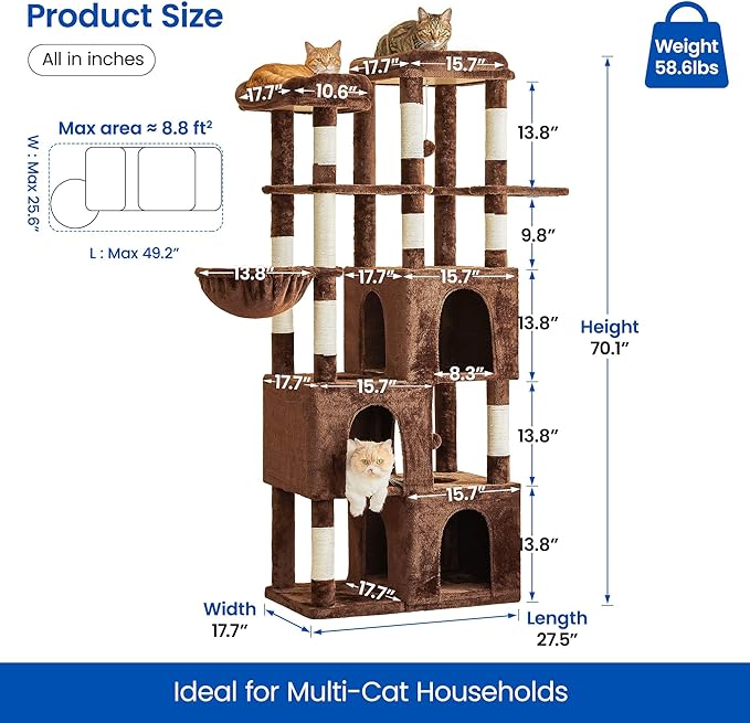 MWPO Extra Large Cat Tree - 70.1-Inch Tall Cat Tower with 3 Cat Condos, Multi-Level Cat Stand for Large Cats Featuring Scratching Posts, Padded Perches, Hammock, Dangling Toys, Brown