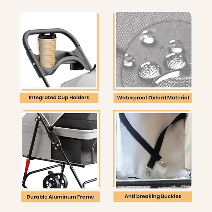 - Safe & Smooth Ride: Four-wheel design with a wide base and reliable rear brakes provides a stable, wobble-free ride. The stroller creates a secure, confined space so your pet can enjoy walks without worry, shielding them from traffic & crowd