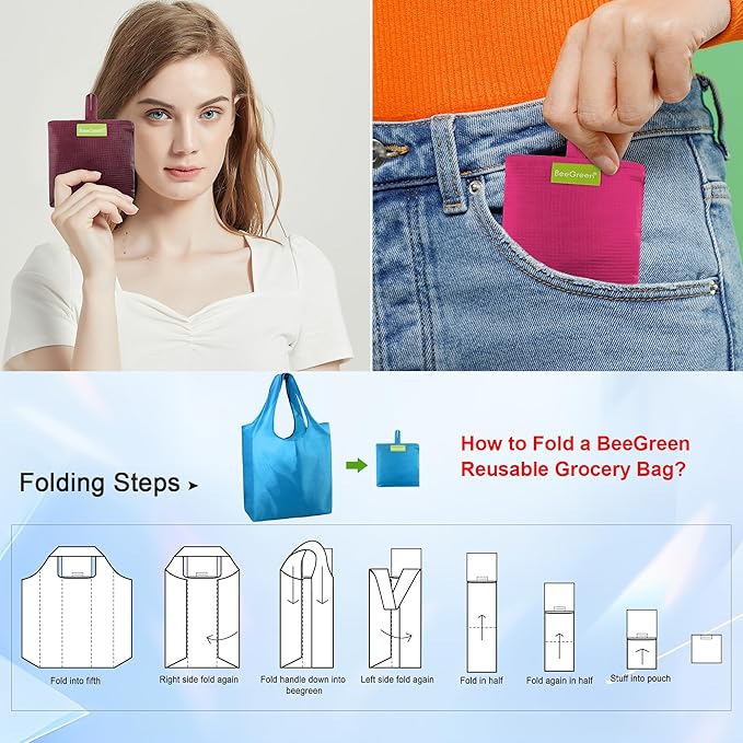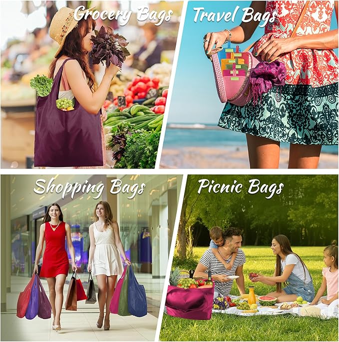- VIBRANT COLORS & EASY TO CARRY: These heavy-duty reusable grocery bags come in 6 rich color choices. They are stylish reusable shopping bags. These foldable reusable grocery bags can be easily folded into their attached pocket-sized pouch, so you can carry these washable reusable bags in your purse or car without taking up too much space. By reusing these sturdy tote bags, let's refuse plastic and keep it out of landfills and oceans!