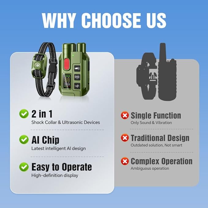 - [Up to 3300 ft Control Range – Perfect for Outdoor Adventures] Enjoy full control even in vast outdoor spaces, with a remote range of up to 3300 feet. Whether you're hiking, playing fetch in the park, or letting your dog run free at the beach, this collar ensures you can manage your dog from a distance. Note: The ultrasonic mode works best up to 16 feet—ideal for indoor training or short-range correction in the backyard. It also supports dual-dog control, so you can train two dogs at once.