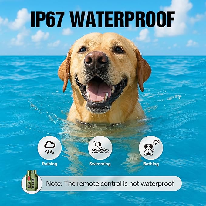 - [IP67 Waterproof – Built for Any Weather Condition] This Dog Shock Collar is IP67 waterproof, making it perfect for all-weather training. Whether your dog loves to splash in puddles, swim in the lake, or you’re training in heavy rain, this collar continues to perform. It’s reliable in extreme conditions like snow, rain, or mud. No need to worry about wet environments—whether it’s hiking, camping, or just playing outdoors, the collar stays effective and ensures continuous training in any weather.