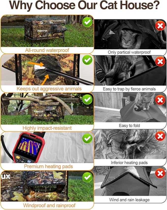 - ๐ช๐ถ๐ป๐ฑ ๐ฎ๐ป๐ฑ ๐ฅ๐ฎ๐ถ๐ป ๐ฅ๐ฒ๐๐ถ๐๐๐ฎ๐ป๐: The elevated, off-ground design of this heated cat bed outdoor prevents moisture buildup. Its heating pad outlet, eaves, roof, and escape door are all waterproof, built to withstand wind and rain. This fully weatherproof heated cat house ensures that your catโs environment remains dry and comfortable.