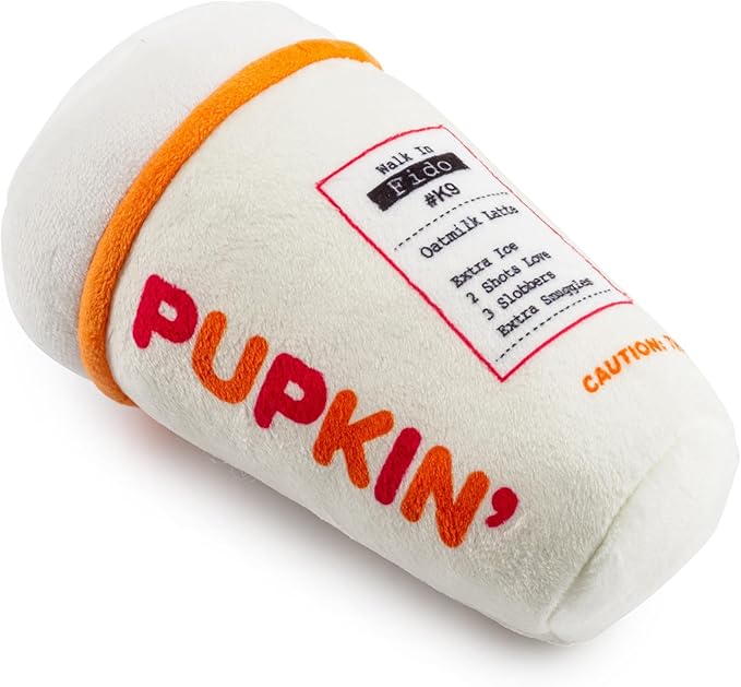 - Funny Parody Plush Dog Toy: Perk up your pooch with a cup of canine caffeine with our Pupkin’ Donuts Hot Coffee Cup dog toy. This funny dog toy features a white plush exterior with a built-in squeaker hidden inside. It’s a fun, cute interactive dog toy that will start any morning off right! One size: 7"x3.75"x3"