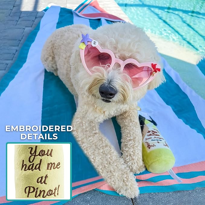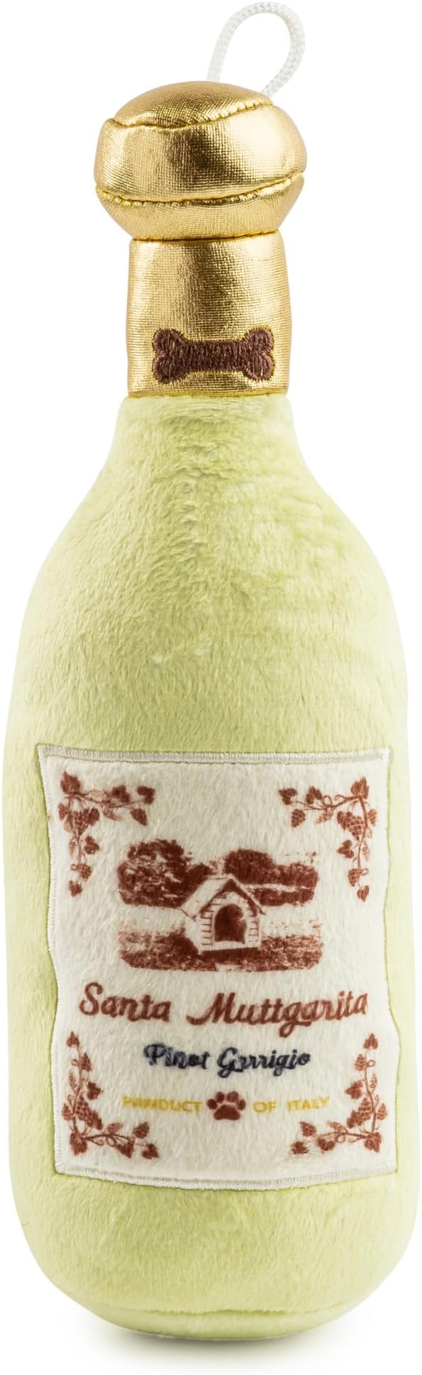 - Funny Parody Plush Dog Toy: Make every moment with your pup a celebration with our Santa Muttgarita Pinot Grrrigio dog toy. This funny dog toy features a soft pale green exterior, golden cap with a built-in squeaker hidden inside. It's a playful, interactive dog toy that turns every playtime into happy hour! One size: 9"x3.25"x2.75"