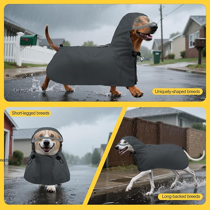 • Adjustable Hood & Customizable Fit for All Body Types: The semi-transparent hood shields your dog’s head without blocking vision, and the drawstring allows a snug fit. Combined with belly magic tape and back cord, it suits round-chested breeds (e.g., Bulldogs) or slender dogs (e.g., Greyhounds)