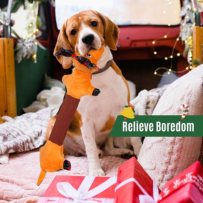 - 【DURABLE & ELASTIC FOR TUG-OF-WAR FUN】Built with premium elastic materials, this reindeer toy is stretchy yet tough, perfect for interactive tug-of-war games with your dog. Designed to withstand aggressive chewing and pulling, it’s a long-lasting companion for energetic pups.