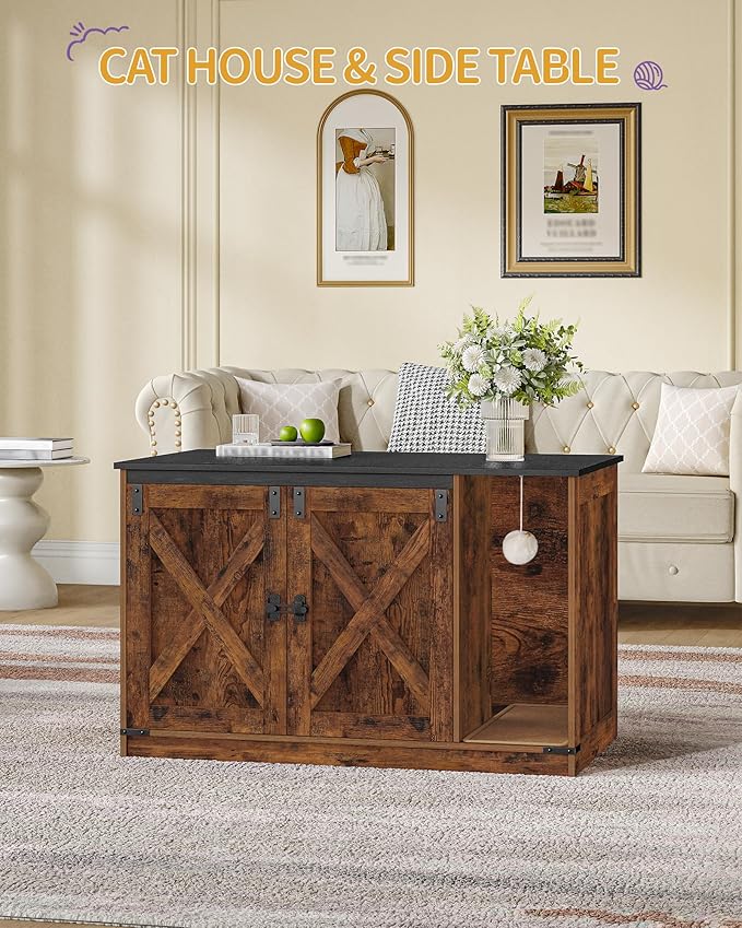 - The Perfect Blend of Family: This rustic style and unique barn door shaped litter box cabinet can be used as a cat litter box or as a finished cat house, giving your cat a comfortable home