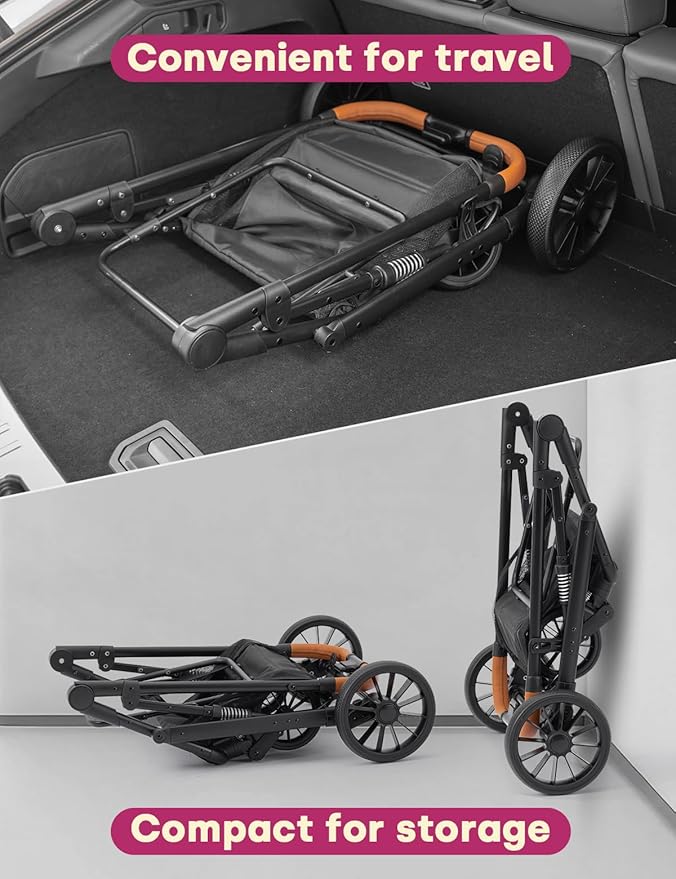 - All Terrain Wheels: Sunthx folding dog stroller with spring suspension system, providing smooth and stable moving. 360° rotating front wheels for superior maneuverability, and 10 inch large rear wheels are suitable for various surfaces. There is a brake on rear wheel to keep the cat stroller safe while not moving