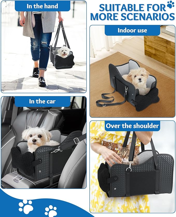 - Safe and Stable: The dog car seat is equipped with adjustable safety straps that can be connected to your dog's chest or harness, ensuring they stay securely in their seat. It also has two adjustable bottom straps with non-slip elastic bands that secure it tightly to the central console, preventing it from shaking or moving during travel
