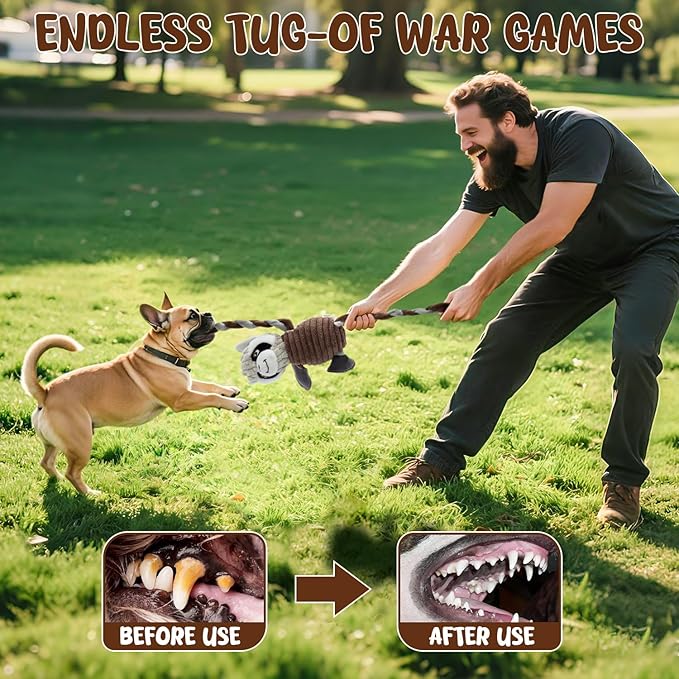 - Tug of War & Improve Relationship:Unique design of pulling limbs, arms and feet pull back and forth through the plush toys body adding in an element of variety. You can play dog's favorite tug-of-war games with them, strengthen your bond with your furry friend while reducing stress and separation anxiety. It’s a great gift for your dog at Christmas, Thanksgiving, Easter, dog birthday and other holidays.