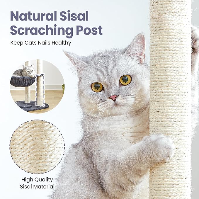 - 【Full Sisal Scratching Surfaces】Every post of the sturdy carpet cat tree with toys is wrapped in natural sisal to help maintain healthy claws by kitty scratchers. Your cat can scratch comfortably whether resting on the platform, in the hammock, or at the base.