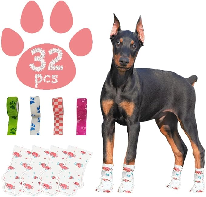 - Package and Size:Package Includes 32 pieces of disposable dog booties and 4 rolls of adjustable bandages. To ensure that your pet is comfortable and well-fitted, it is recommended to choose the right size according to the size chart in the product picture.