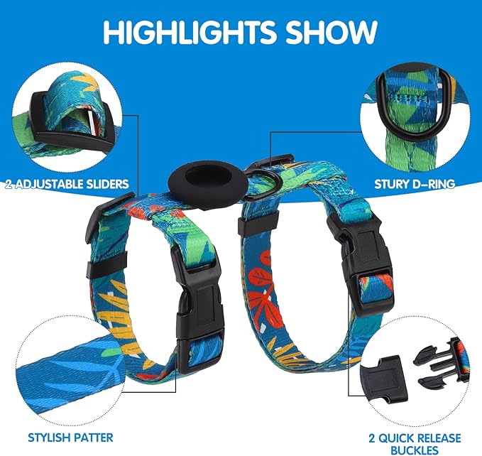 BINGPET Cat Harness and Leash Set Escape Proof for Walking,Adjustable Kitten Harness with Airtag Holder for Small Medium Large Cats (Green Leaves Print,Neck:8"-12",Chest:12.5"-18")