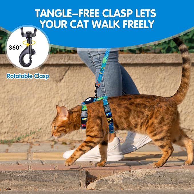 - ESCAPE PROOF: The upgraded design of the escape proof cat harness includes two quick-release buckles—one on the neck and one on the chest—for easy on/off and added security. A sturdy D-ring connects to a 360°rotatable leash clasp, ensuring smooth movement and strong escape resistance. Enrich your feline’s life while keeping them safe