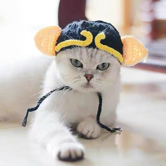 - ADORABLE DESIGN: Cute black knitted cap with yellow decorative pattern and soft orange ear attachments, perfect for dressing up your feline friend