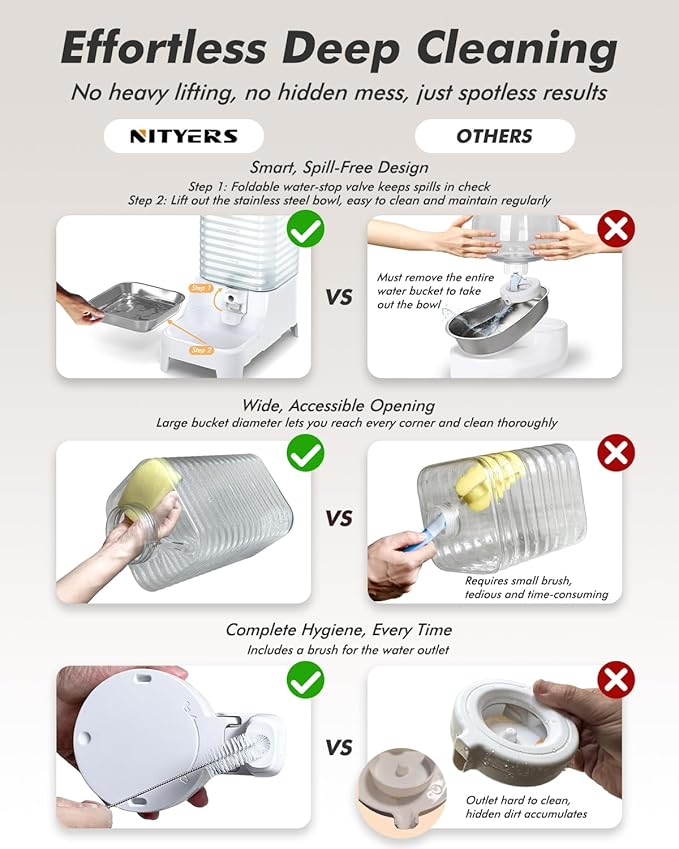 - Lifetime Satisfaction: Endorsed by pet lovers and trusted by households, the Nityers gravity water bowl for dogs and cats combines innovative design with durability. As a professional pet supplies manufacturer, we believe high quality and friendly service are our constant aim. We go the extra distance to ensure our automatic pet water dispenser rise above the rest. If an item is found defective within a year, we will issue a replacement. For any questions or concerns, please contact our friendly and professional 24/7 customer support team. **Search “B0DSVHP5LM” to find the matching pet food mat for your Nityers pet waterer
