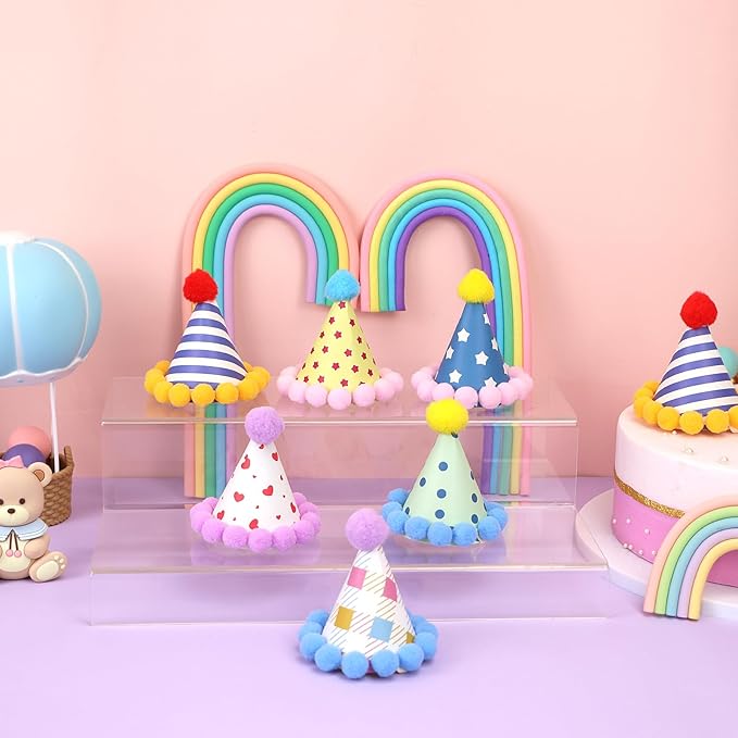 - Eye-catching Design: These stuffed animal party hats feature a charming cone shape adorned with felt pom poms at both the tip and bottom. With 6 vibrant designs to choose from, these mini hats will make your pets look even more adorable.