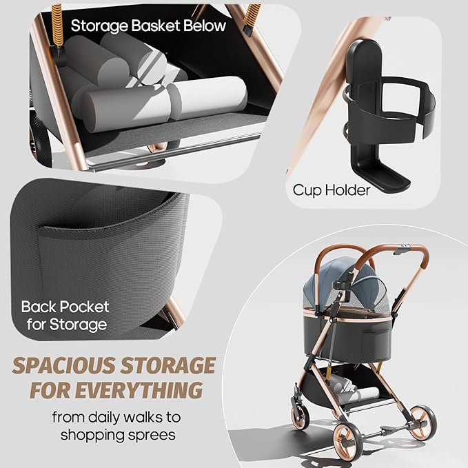 - FLEXIBLE STORAGE SOLUTIONS – With the spacious storage basket, convenient cup holder, and practical mesh pockets, you’ll have everything you need within easy reach. These thoughtful features are ideal for keeping pet treats, water, and your personal items organized, making every outing with your puppy a delightful experience.