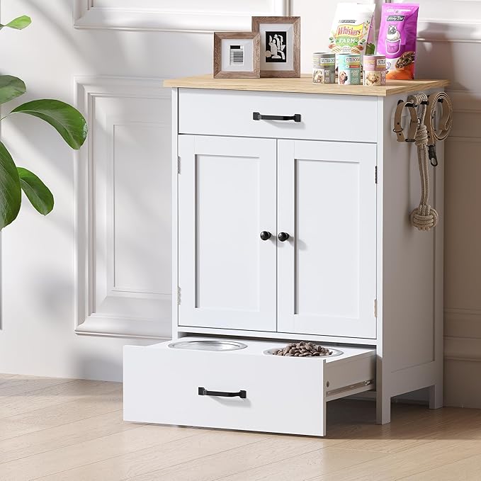 Dog Feeding Station with 2 Elevated Dog Bowls, Food Storage with Adjustable Shelf and Sliding Drawer, Hidden Pet Feeder Station for Cats and Dogs, White