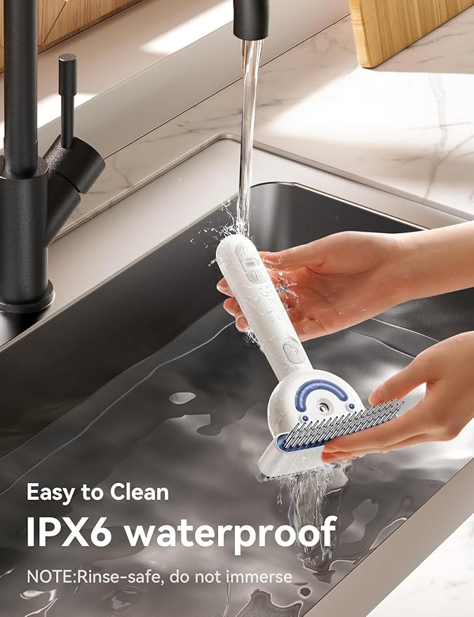 - IPX6 Waterproof & Visible Battery & Water Tank - IPX6 waterproof allows direct rinsing; steel teeth ensure durability. With 4 LED battery indicators and a transparent water tank, the lightweight and ergonomic handle makes grooming and travel convenient—especially useful for quick clean-ups after outdoor adventures with long-haired companions