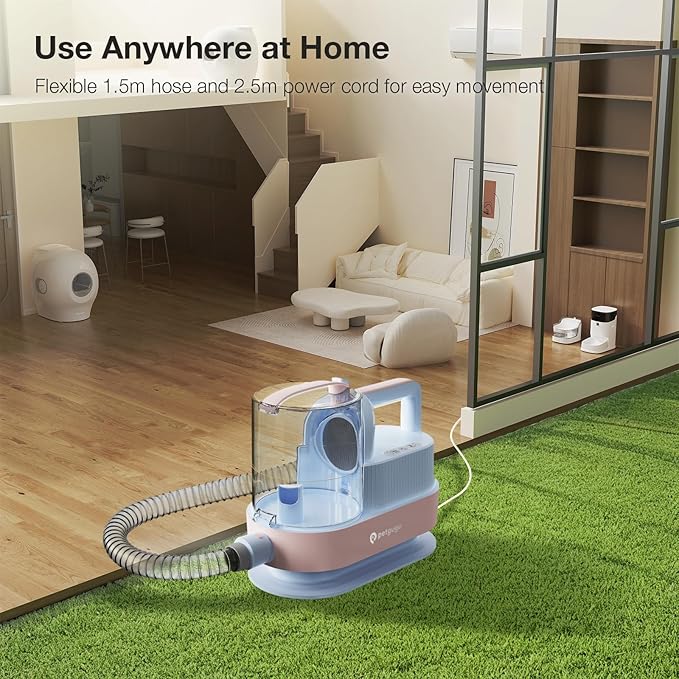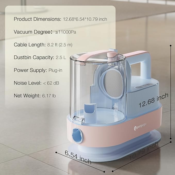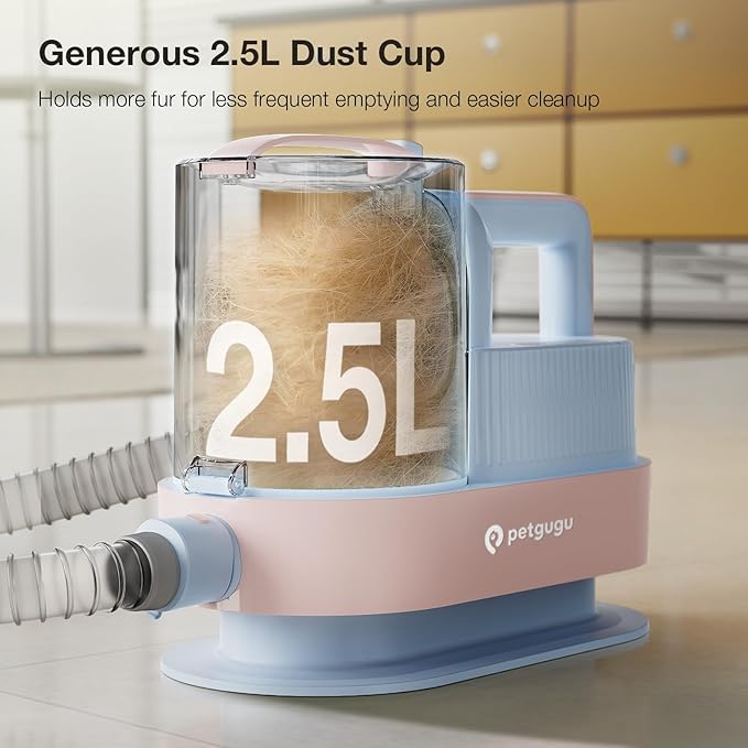 - Strong Suction with Large 2.5L Dust Cup: Equipped with 11000Pa suction power, this pet grooming vacuum for dogs captures 99% of loose hair and dander directly into a large 2.5-liter (0.66 gallons) dust cup. The roomy dustbin reduces frequent emptying, keeping your home clean from pet hair mess. Use the included nozzle and cleaning brush to remove hair from sofas, carpets, and floors effortlessly.