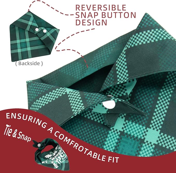 - Easy Snap Button Closure: Secure snap button makes it quick and easy to put on or remove the bandana, ensuring a comfortable fit that stays in place during play, walks, or parties. Triangle Scarf for All Breeds: Classic triangle shape fits comfortably on medium and large pets (25lbs-75lbs), making it a versatile accessory for any pup